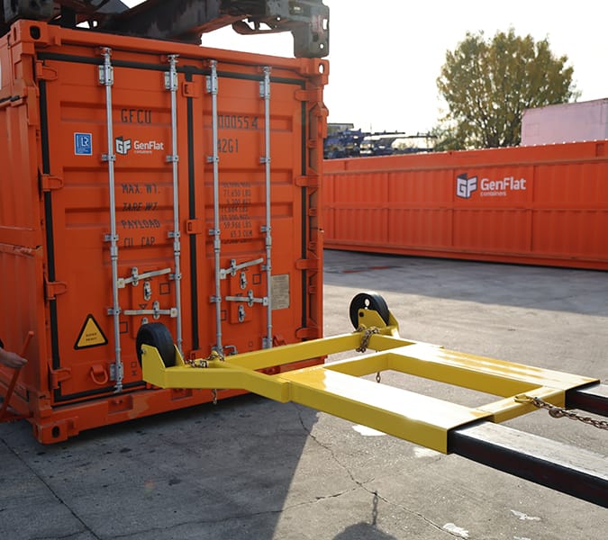 The Genny attaches to the forks of a forklift and is secured to the forklift with a safety chain.