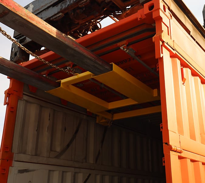 Once four GenFlat containers are stacked and locked together, they can be lifted as a single unit, ready for multi-modal transport.